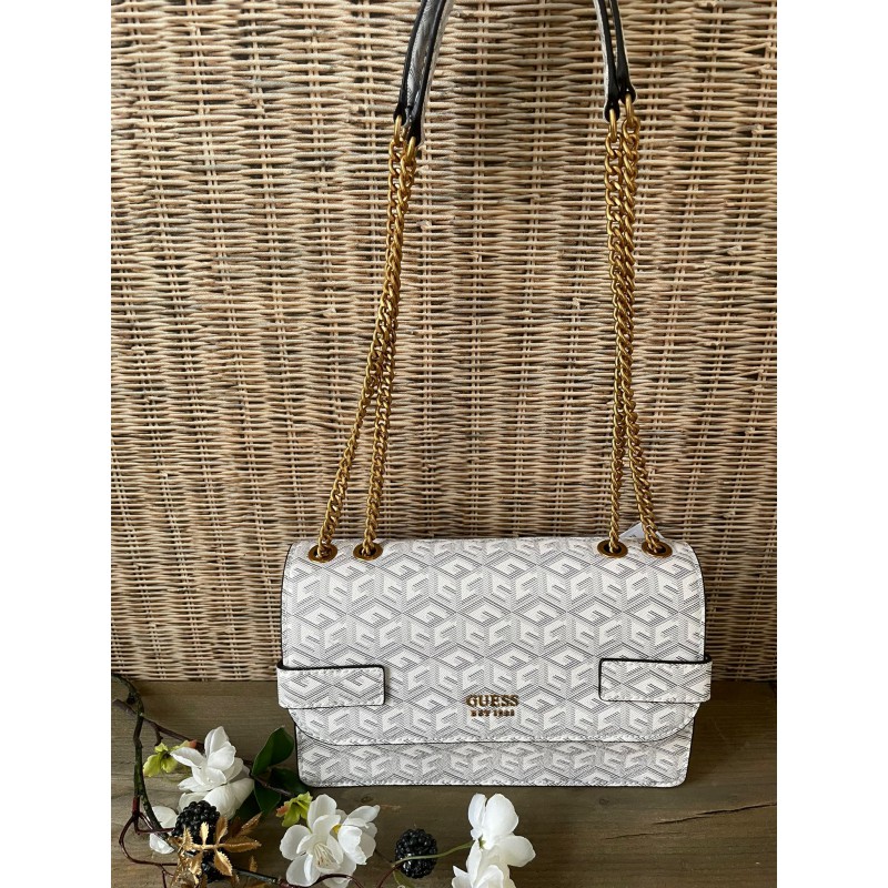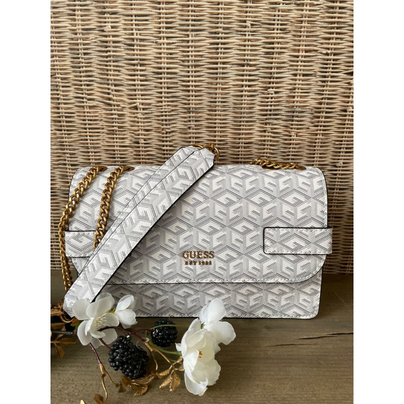 Weer een pareltje uit de nieuwe Guess collectie. De Guess Atene crossbody. Op de voorzijde bevindt zich een goudkleurig Guess logo. De tas bestaat uit twee hoofdvakken met een tussenschot, er is ook ruimte om meerdere pasjes op te bergen. De tas sluit zich met een magneetsluiting. De schouderband bestaat deels uit een prachtige goudkleurige geschakelde ketting. De schouderband is niet afneembaar. Aan de achterzijde van de tas bevindt zich een extra rits.