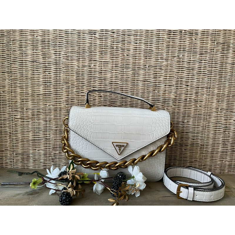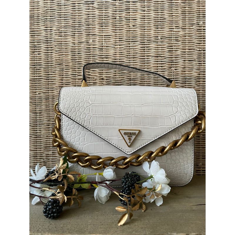 Deze handtas van Guess uit de Retour collectie is wel een uitblinker. Deze gave krokoprint wilt toch iedereen aan zijn schouder hebben hangen. Aan de voorkant bevindt zich een Guess logo. De grove geschakelde ketting geeft een stoere uitstraling. De tas bestaat uit een hoofdvak waarin ook pasjes kunnen worden opgeborgen, er zit nog een klein vakje met een rits aan de binnenkant. De tas sluit door middel van een magneetsluiting. De schouderband is afneembaar en verstelbaar. Aan de achterzijde van de tas bevindt zich nog een extra rits.