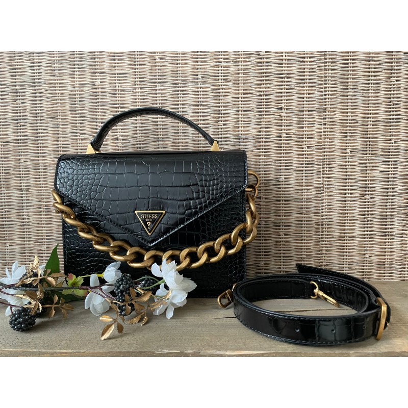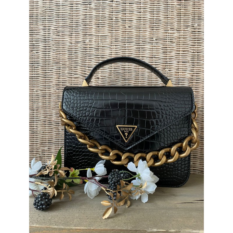 Deze handtas van Guess uit de Retour collectie is om verliefd op te worden. Deze gave krokoprint wilt toch iedereen aan zijn schouder hebben hangen. Aan de voorkant bevindt zich een Guess logo. De grove geschakelde ketting geeft een stoere uitstraling. De tas bestaat uit een hoofdvak waarin pasjes kunnen worden opgeborgen, er zit ook nog een klein vakje met rits aan de binnenkant. De tas sluit door middel van een magneetsluiting. De schouderband is afneembaar en verstelbaar. Aan de achterzijde van de tas bevindt zich nog een extra rits.