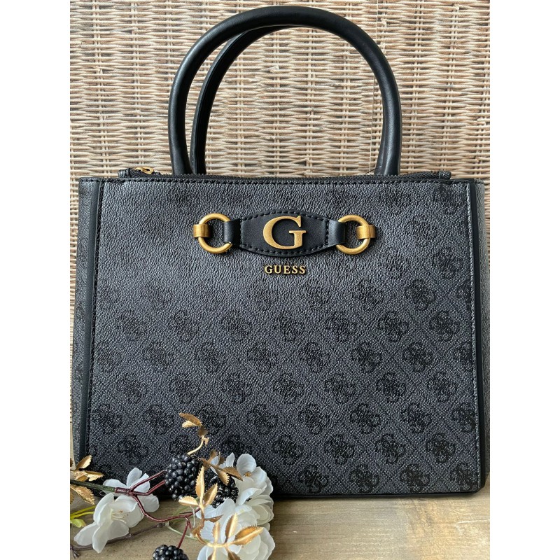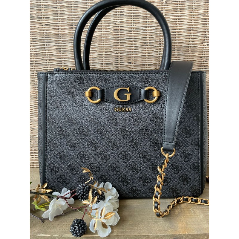 Hier een volmaakte Guess handtas uit de Izzy collectie met all-over print. Aan de voorzijde een Guess logo met goudkleurige details. De tas heeft twee hoofdvakken met goudkleurige ritsen en een hoofdvak dat sluit met een magneetsluiting. Draag jij de tas liever aan de schouder? De gevlochten schouderband met goudkleurige details is perfect. De schouderband is afneembaar. Aan de achterzijde van de tas bevindt zich een rits.