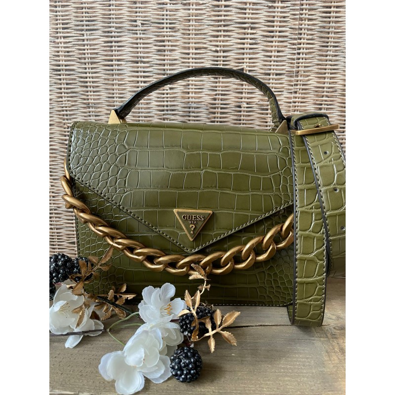 Val jij graag op? Dan is deze handtas van Guess uit de collectie Retour echt iets voor jou. Deze gave krokoprint wilt toch iedereen mee in de hand lopen. Aan de voorkant bevindt zich een Guess logo. De grove geschakelde ketting geeft een stoere uitstraling. De tas bestaat uit een hoofdvak waarin pasjes kunnen worden opgeborgen, ook een klein vakje met rits bevindt zich aan de binnenkant van de tas. De tas sluit door middel van een magneetsluiting. De schouderband is afneembaar en verstelbaar. Aan de achterzijde van de tas bevindt zich nog een extra rits.