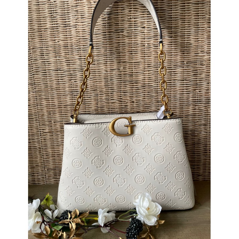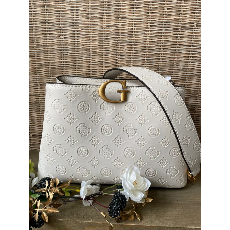 Deze Guess schoudertas met all-over print uit de G Vibe collectie is een schitterende beauty. Aan de voorzijde van de tas is een prachtige goudkleurige G verwerkt. De tas bestaat uit twee hoofdvakken. De scheidingswand is met een ritssluiting. De tas heeft een magneetsluiting. De grove geschakelde ketting aan de schouderband is een echte eye catcher. De schouderband is afneembaar.