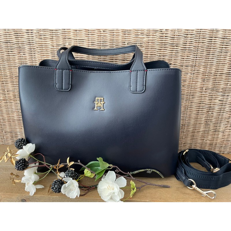 Wat een pareltje, de Iconic Tommy Satchel Handtas. In stijl naar je werk? Dat gaat met deze beauty zeker lukken. Aan de voorzijde een prachtig goudkleurig embleem. In het midden van de tas bevindt zich een hoofdvak met ritssluiting. Aan beide kanten van dit hoofdvak nog twee vakken die sluiten met een magneetsluiting. De tas heeft twee handvaten en een afneembare schouderband. Goed te combineren met een van de nieuwe stijlvolle portemonnees uit de Tommy Hilfiger collectie. Deze zijn ook te vinden op onze website.