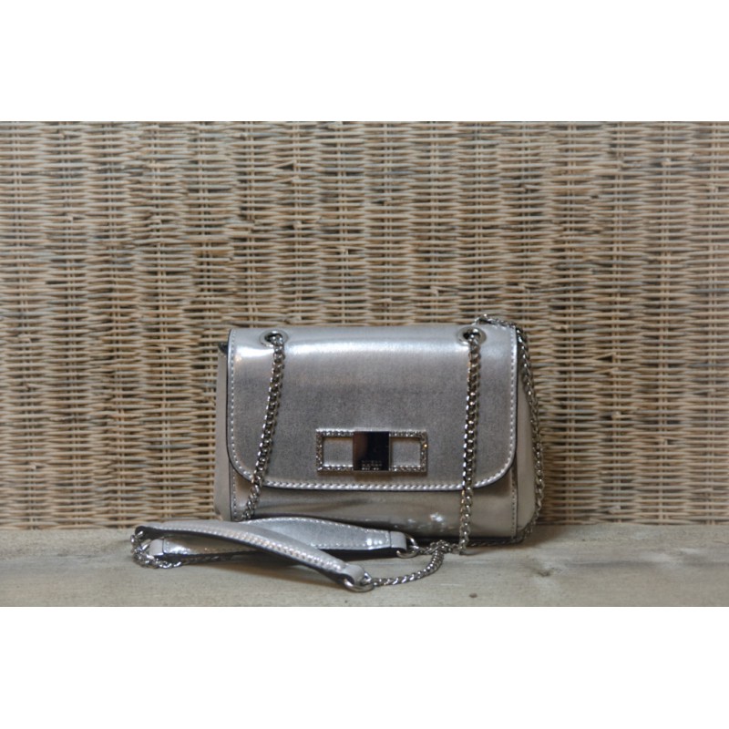 Met deze zilveren Guess schoudertas steel jij vast en zeker de show. Deze glimmende zilverkleurige schoudertas is afgesloten door een klep met daar op een zilveren Guess logo omgeven door schitterende strass steentjes. De klep wordt afgesloten door 2 magneet drukknopen en heeft binnenin een ritsvak en drie insteekvakjes voor pasjes. De tas heeft een platte zilver kleurige schakel schouderband met een tussenstuk van zilverkleur. De schouderriem is dubbel te dragen of enkel. Wie wil er niet schitteren met deze schitterende Guess schoudertas.